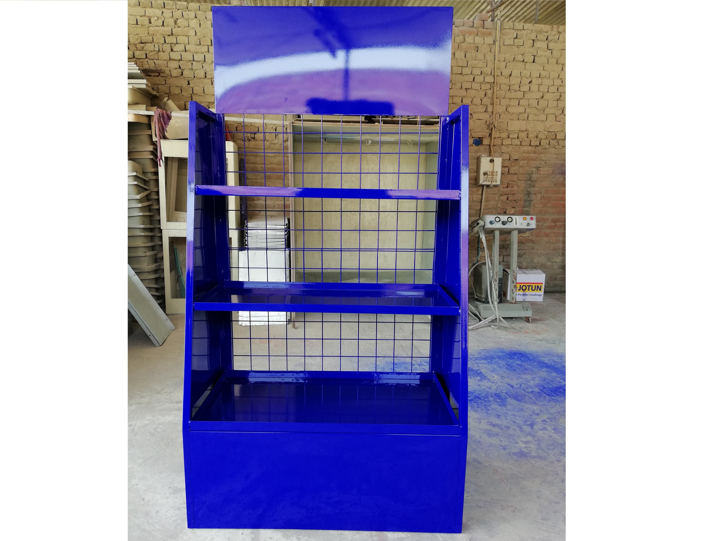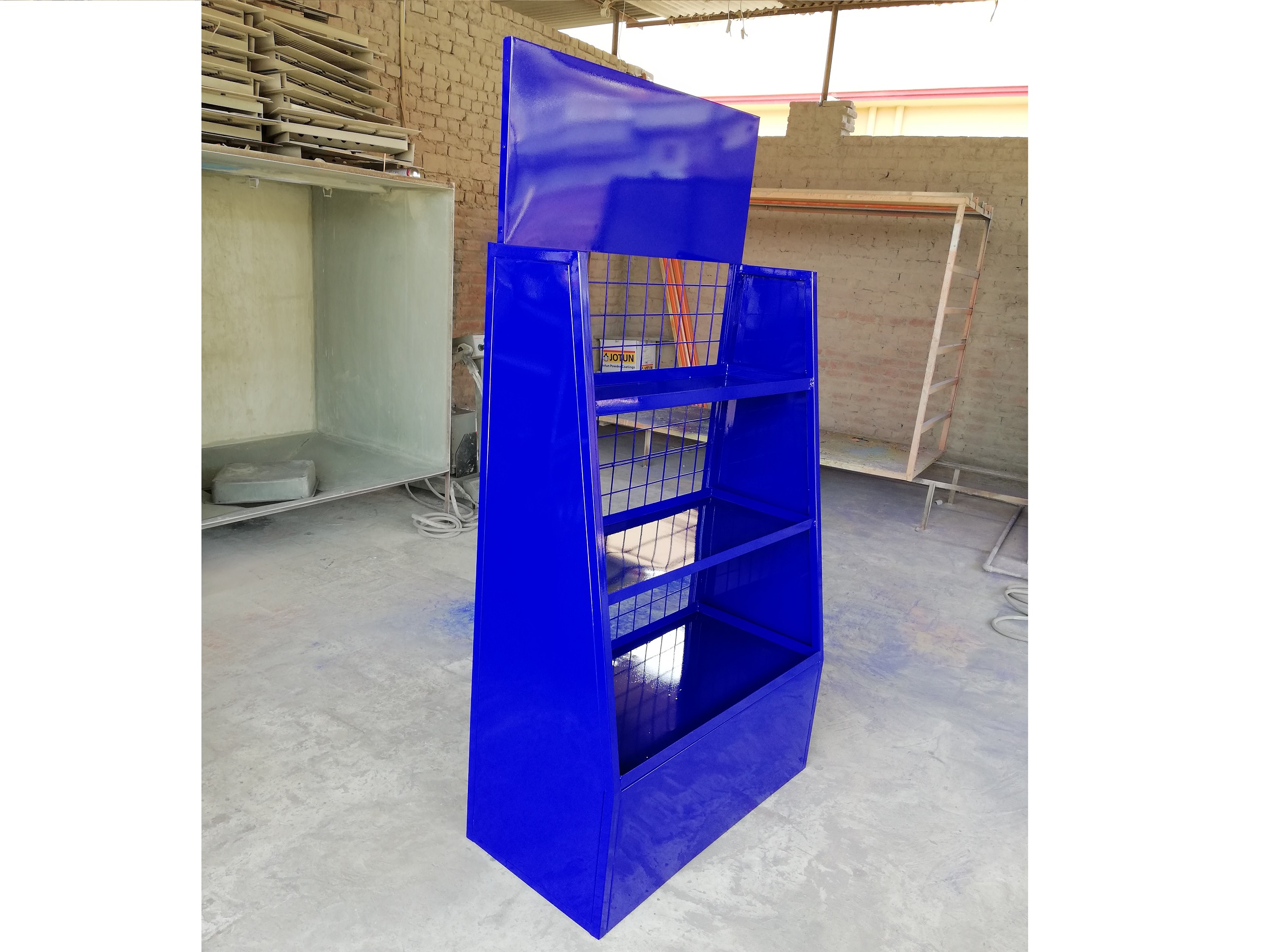 is can make by galvonized sheet which is much durable then the other iron sheet as a paint we use the powder coating paint for our racks which can protect it from rust much more longer time.
